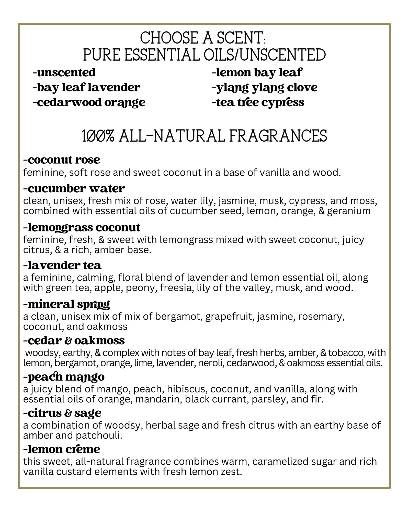 *Natural Fragrance Oils are made with isolates of aromatic compounds from plants and are considered completely natural, although different from essential oils.